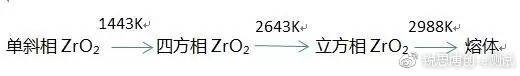 氧化锆在不同条件下有三种不同的晶型存在:立方相(c-ZrO2),密度6.27g/cm3,四方相(t-ZrO2),密度6.10 g/cm3和单斜相(m-ZrO2),密度5.65 g/cm3。以上3种晶型存在于不同的温度范围,并可以相互转化。它们分别在2643 K以上、1443~2643 K之间和小于1443 K温度范围内稳定。